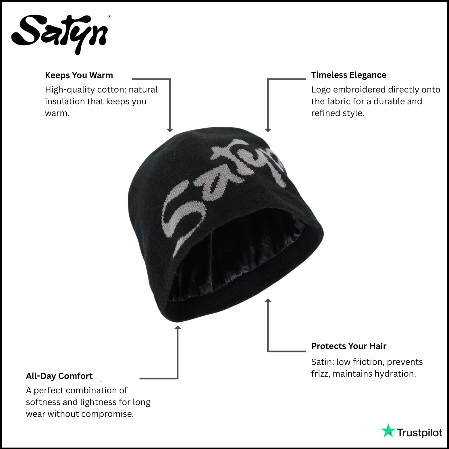 Take care of your hair in style now with our Satyn beanie, the essential accessory to combine modern style and hair care! This beanie is offered for streetwear lovers and those looking for functionality without compromising on their look. Our beanie is a perfect balance between aesthetics and well-being.